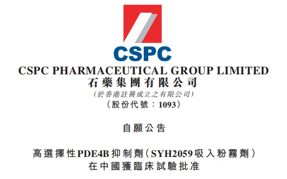 石药集团高选择性PDE4B抑制剂(SYH2059吸入粉雾剂)在中国获批临床