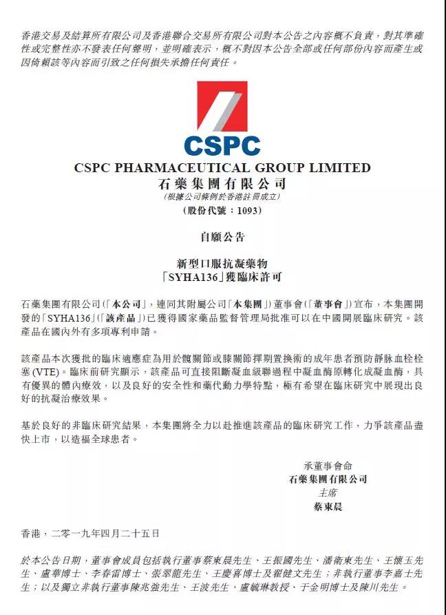 石药集团开发的新型口服抗凝药物“SYHA136”已获临床许可