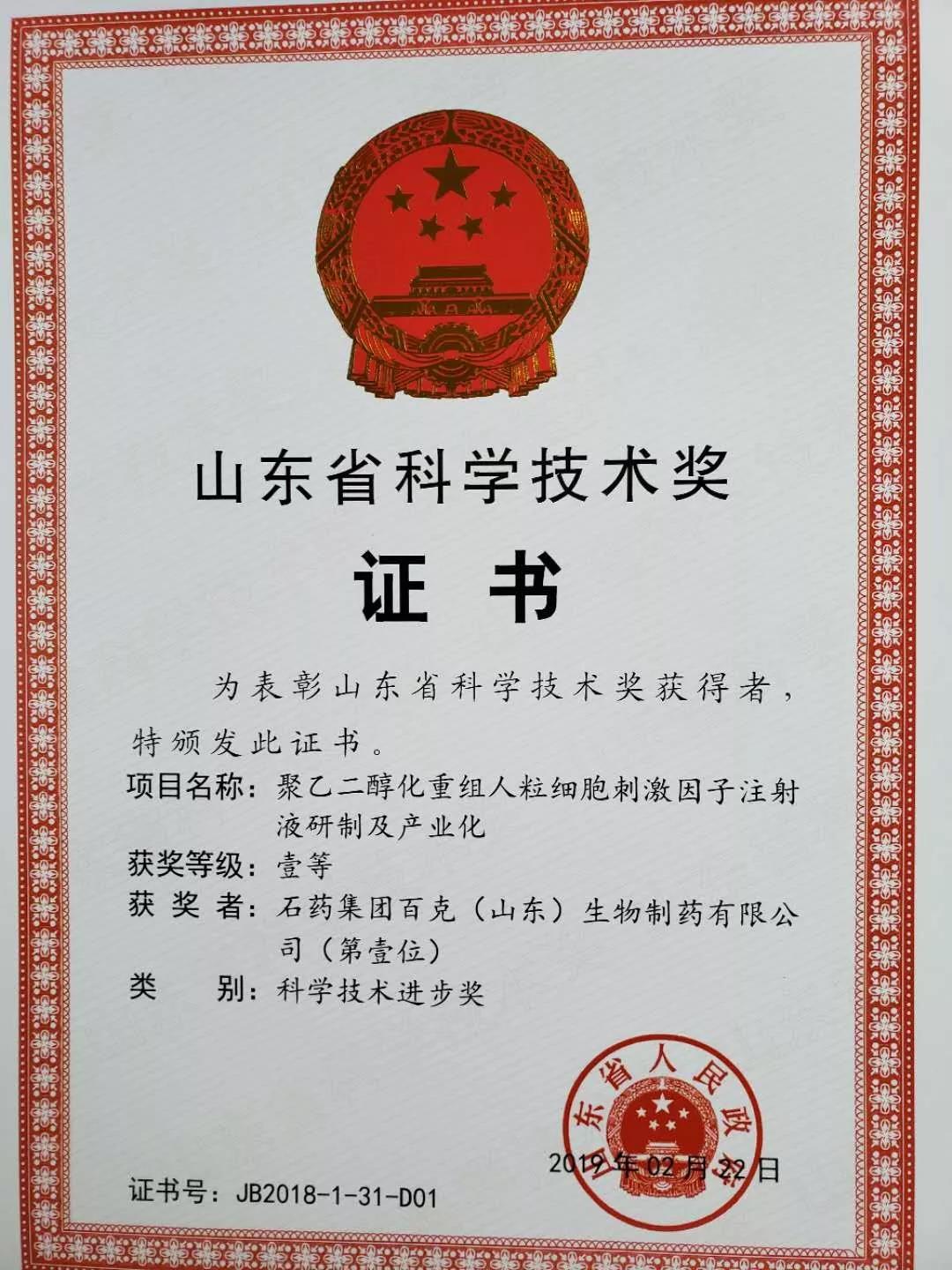 会上,石药集团百克(山东)生物制药有限公司战略产品“聚乙二醇化重组人粒细胞刺激因子注射液”(商品名:津优力)荣获2018年度“山东省科学技术进步一等奖”。