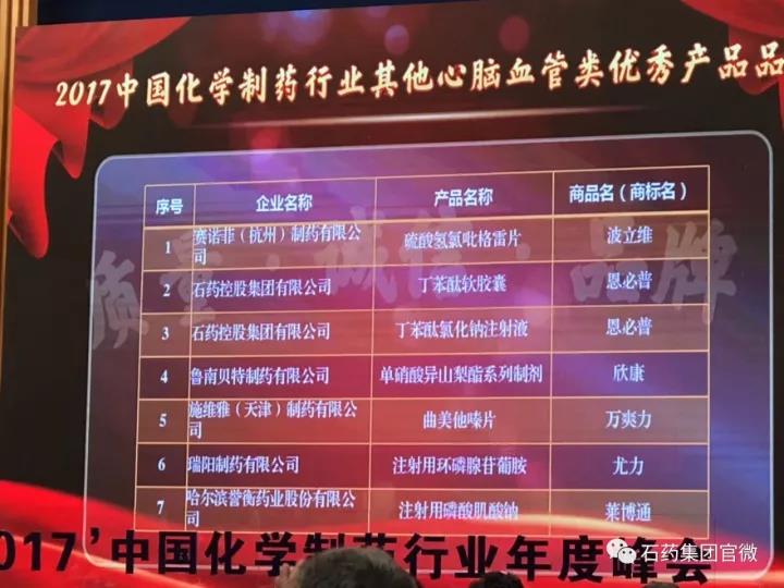 峰会发布了由中国化学制药工业协会、中国医药商业协会、中国非处方药物协会、中国医药企业发展促进会、国药励展展览有限责任公司共同组织推荐的“2017中国化学制药行业优秀企业和优秀产品品牌”榜。石药控股集团荣获“2017中国医药行业企业集团十强”“2017中国化学制药行业创新型优秀企业品牌”等荣誉,石药丁苯酞软胶囊荣获“2017中国化学制药行业专利药、原研药优秀产品品牌”,丁苯酞氯化钠注射液荣获“2017中国化学制药行业创新药特设奖”。