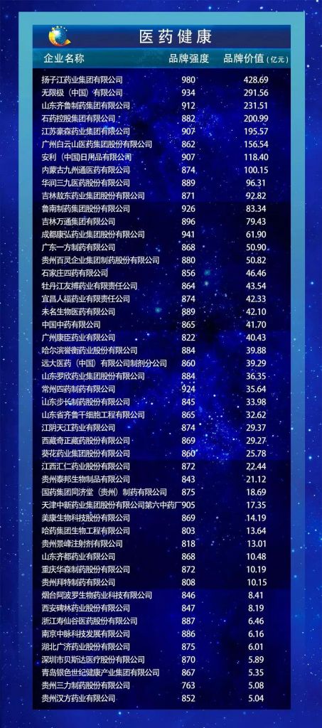 以下为2019中国品牌价值评价信息医药健康领域发布名单: