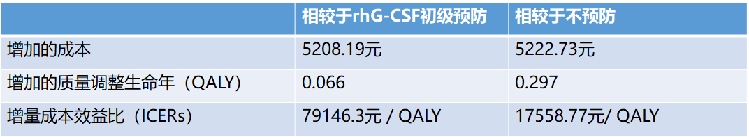 在中国早期乳腺癌患者化疗后,相较于rhG-CSF初级预防或者不预防,尽管使用PEG-rhG-CSF初级预防的成本更高,但考虑到患者的综合效益,给予PEG-rhG-CSF初级预防是更具成本效益的选择。