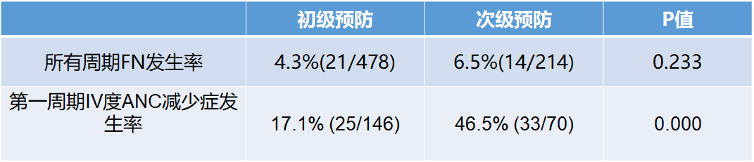 • 在第一个周期的化疗中,初级预防IV度ANC减少的发生率显著低于次级预防(p=0.000)。