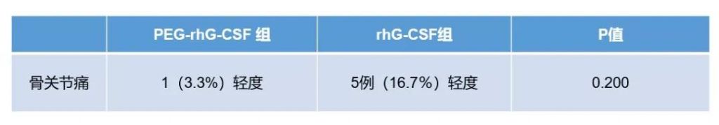 •本研究两组患者中,PEG-rhG-CSF组和rhG-CSF的疗效无统计学意义,安全性良好,不良反应发生率均很低且为轻度可耐受,并且两组均未出现因不耐受而退出试验的病例。