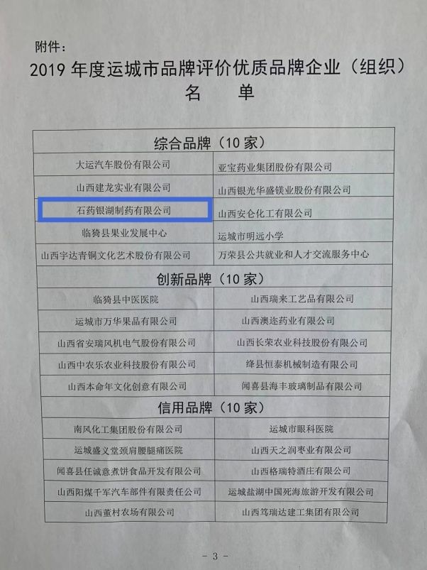 1月15日,运城新闻网正式公示了运城市2019年度优质品牌企业(组织)名单,石药银湖制药有限公司成功被运城市品牌战略工程领导小组评选为运城市2019年度优质品牌企业,荣获“综合品牌”称号。