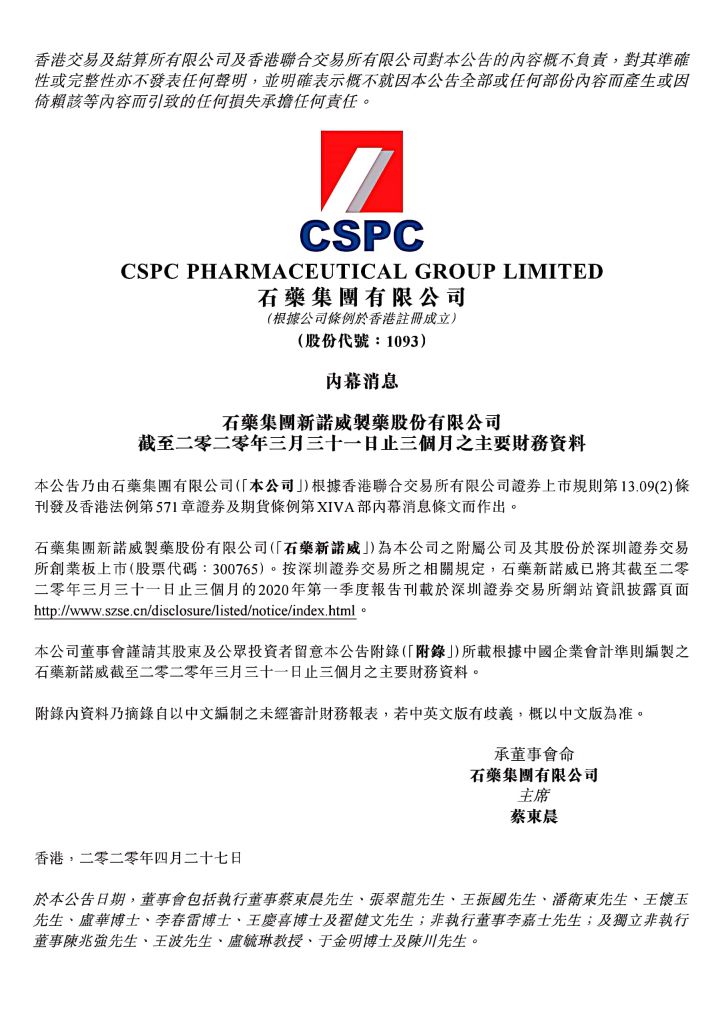 4月27日,石药集团(01093-HK)公布,公司之附属公司石药新诺威(300765-CN)于深交所刊发2020年第一季度报告。
