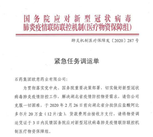 2月18日,国务院应对新型冠状病毒肺炎疫情联防联控机制医疗物资保障组发来“紧急任务调运单”,要求石药集团在2月26日前向湖北省分批供应盐酸阿比多尔片20万盒。接到调运单后,石药集团连夜部署,快速响应国家要求,全力以赴保证生产,车间所有人员放弃假期,24小时三班倒,在满足多地疫区需求叠加的情况下,于2月24日提前完成20万盒紧急任务。
