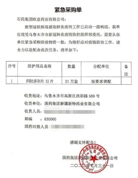 疫情当前,刻不容缓。接到采购单后,石药集团欧意药业迅速采取应对措施,在盐酸阿比多尔片正常供应已比较紧张的情况下,所有库存优先保障此次采购,并且启动紧急排产计划,保障满足新疆抗疫采购需求。