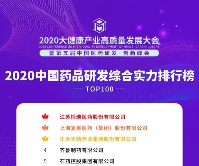 9月10日,“2020大健康产业高质量发展大会暨第五届中国医药研发·创新峰会(PDI)”在重庆市南岸区开幕。大会发布了《2020中国药品研发实力排行榜》系列6大榜单,百余家国内医药行业中坚力量、创新领衔企业入榜最受瞩目的《2020中国药品研发综合实力排行榜 TOP100》 。其中,我集团强势入选前五,完美体现石药研发实力。