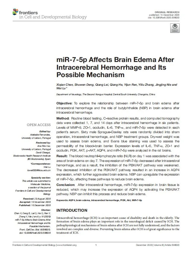 来自中南大学湘雅二医院神经内科卢伟教授研究团队的最新成果《miR-7-5p Affects Brain Edema After Intracerebral Hemorrhage and Its Possible Mechanism 》在《Frontiers in Cell and Developmental Biology》杂志发表(IF2020: 5.201)。