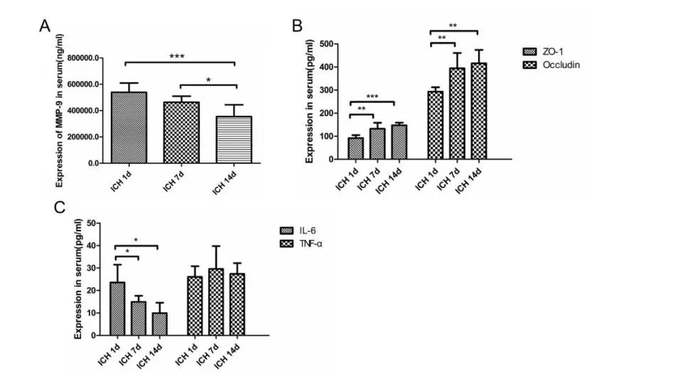 图1:脑出血患者血清中MMP-9(A)在脑出血第14天较脑出血第1天及脑出血第7天均下降,ZO-1(B)在脑出血第7天及第14天较脑出血第1天升高,Occludin(B)在脑出血第7天及第14天较脑出血第1天升高,IL-6(C)在脑出血第7天及脑出血第14天较脑出血第1天下降,TNF-α(C)在脑出血三个时间点变化不明显。*P<0.05,**P<0.01,***P<0.001