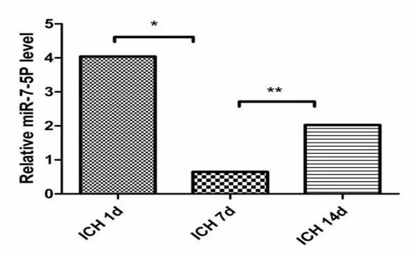 图2:患者脑出血后第7天miR-7-5p明显低于第1天,第14天时部分回升。*P<0.05,**P<0.01