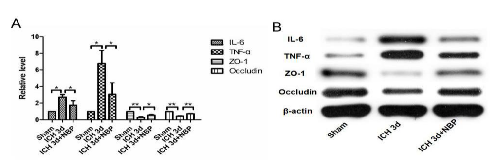 图片图8:丁苯酞干预后,IL-6和TNF-α较脑出血对照组下降(A,B),而紧密连接蛋白ZO-1和Occludin(A,B)较脑出血对照组升高。*P<0.05,**P<0.01