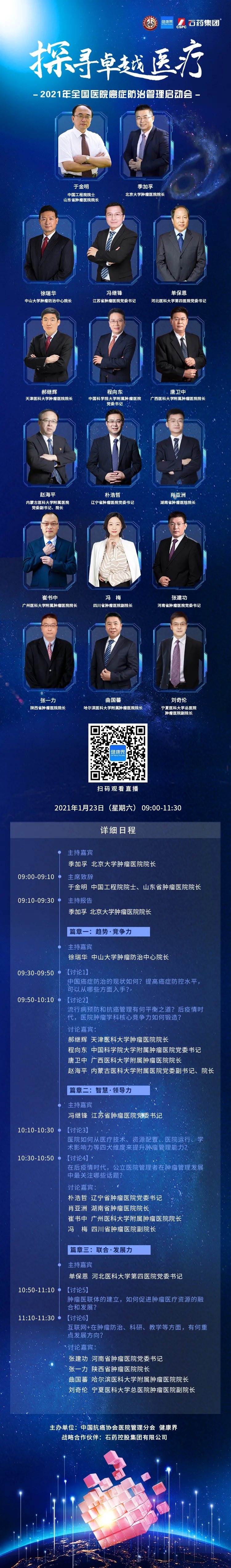 基于此,中国抗癌“最强大脑”将并肩齐跑——中国抗癌协会医院管理分会联合健康界和石药集团共同举办“探寻卓越医疗——全国医院癌症防治管理”系列会议,全年将开设1场启动会、10场线下/ 线上研讨会、1场年度总结论坛等。2021年1月23日(周六)9:00-11:30,20余位顶级肿瘤医院管理者将集结在启动会上,即将传递未来肿瘤防治最强音。