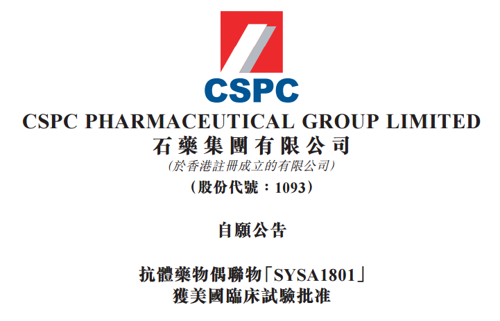 7月16日,石药集团(1093.HK)公告,集团研发的抗体药物偶联物(Antibody-Drug Conjugate)SYSA1801的试验性新药(IND)申请已获美国食品药品监督管理局(FDA)批准,可开展Claudin 18.2 阳性表达的晚期胰腺癌的临床试验。I期临床试验将会评估SYSA1801 的安全性、耐受性、药代动力学特性及初步疗效。
