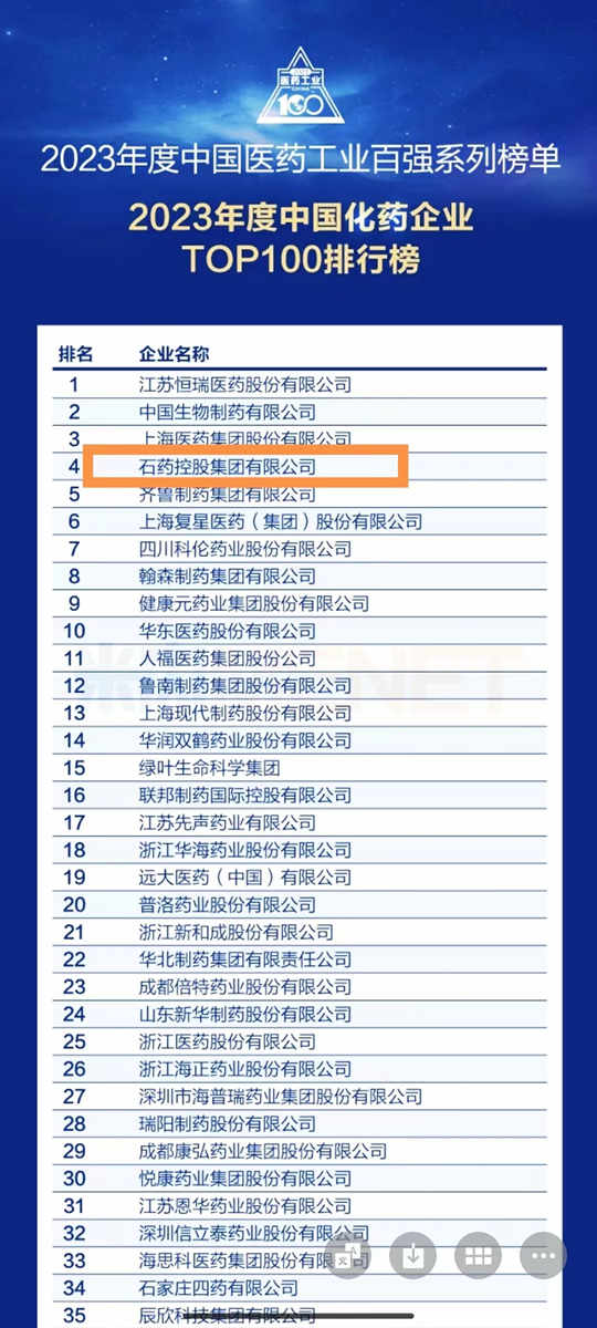 石药集团入选2023年中国化药企业TOP100榜单