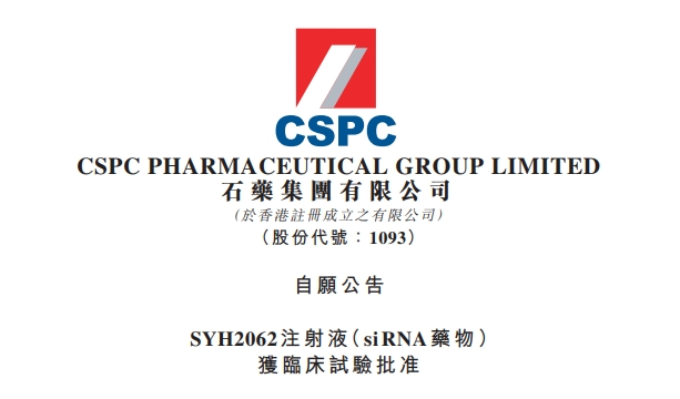12月23日,石药集团宣布,本集团自主研发的化学1类新药SYH2062注射液(双链小干扰RNA(siRNA)药物)(下称:该产品)已获得中华人民共和国国家药品监督管理局批准,可以在中国开展临床试验。