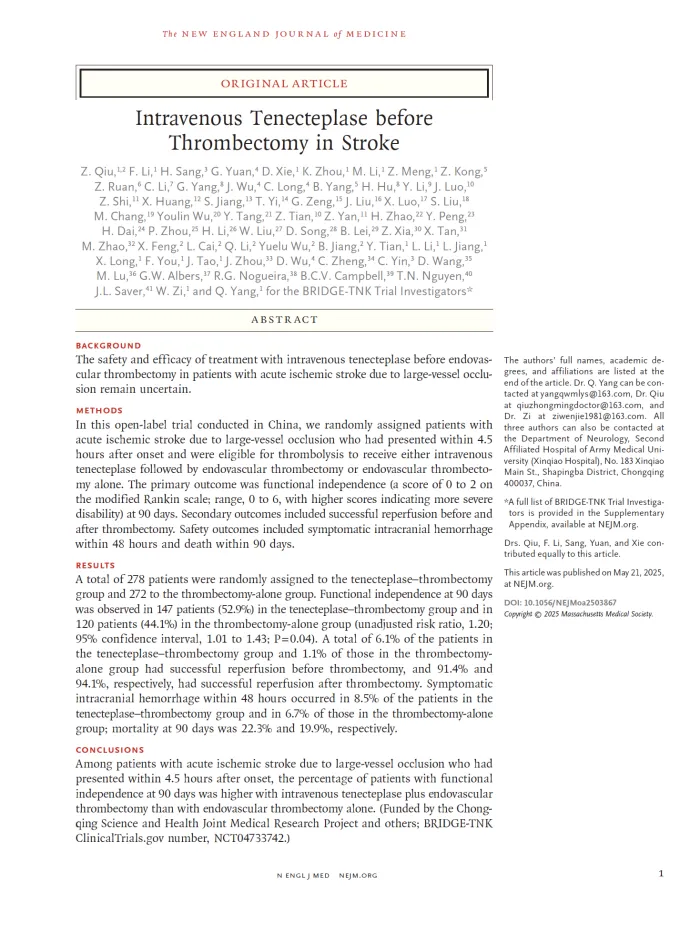 2025年5月21日,陆军军医大学第二附属医院神经内科杨清武教授和资文杰教授团队牵头、全国共39家卒中中心参与的《替奈普酶静脉溶栓联合取栓术对比单独取栓术治疗急性大血管闭塞性卒中的多中心随机对照试验(BRIDGE-TNK)》[4]登顶《新英格兰医学杂志》(NEJM),并同步于欧洲卒中组织会议(ESOC 2025)开幕式全体会议向全球发布!试验表明,对于4.5小时内大血管闭塞性卒中患者,静脉注射替奈普酶联合血管内取栓术相比单纯取栓术,可显著提高患者90天功能独立性(52.9% vs 44.1%,P=0.04),且安全性良好。