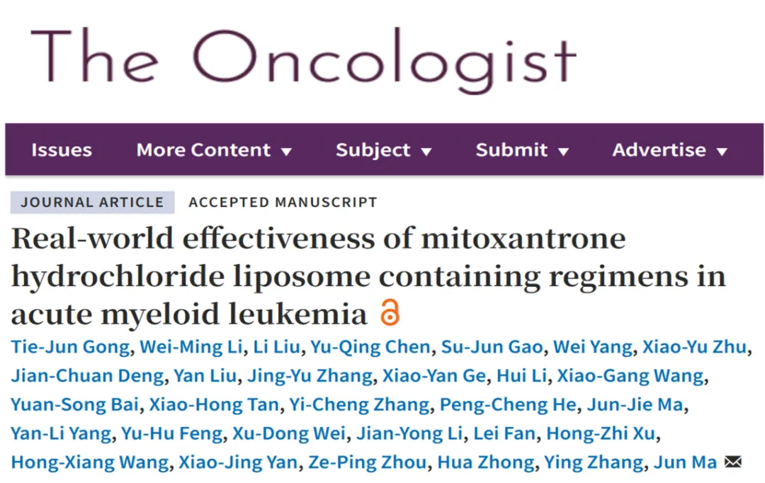 近期, 一项由哈尔滨血液病肿瘤研究所马军教授牵头开展的,盐酸米托蒽醌脂质体注射液治疗急性髓系白血病(AML)的全国多中心、真实世界研究结果于《The Oncologist》杂志正式发表,该数据首次披露了真实世界中米托蒽醌脂质体在AML患者的疗效以及安全性,为其在白血病的应用提供更多循证证据。