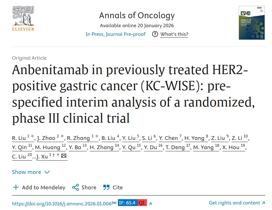 近日,由石药集团与江苏康宁杰瑞生物制药有限公司合作开发的安尼妥单抗(KN026)针对HER2阳性胃癌/胃食管结合部腺癌患者的III期临床研究结果成功发表于肿瘤学领域顶级期刊《肿瘤学年鉴》(Annals of Oncology,IF:65.4),标题为Anbenitamab in previously treated HER2-positive gastric cancer (KC-WISE): pre-specified interim analysis of a randomized, phase III clinical trial。