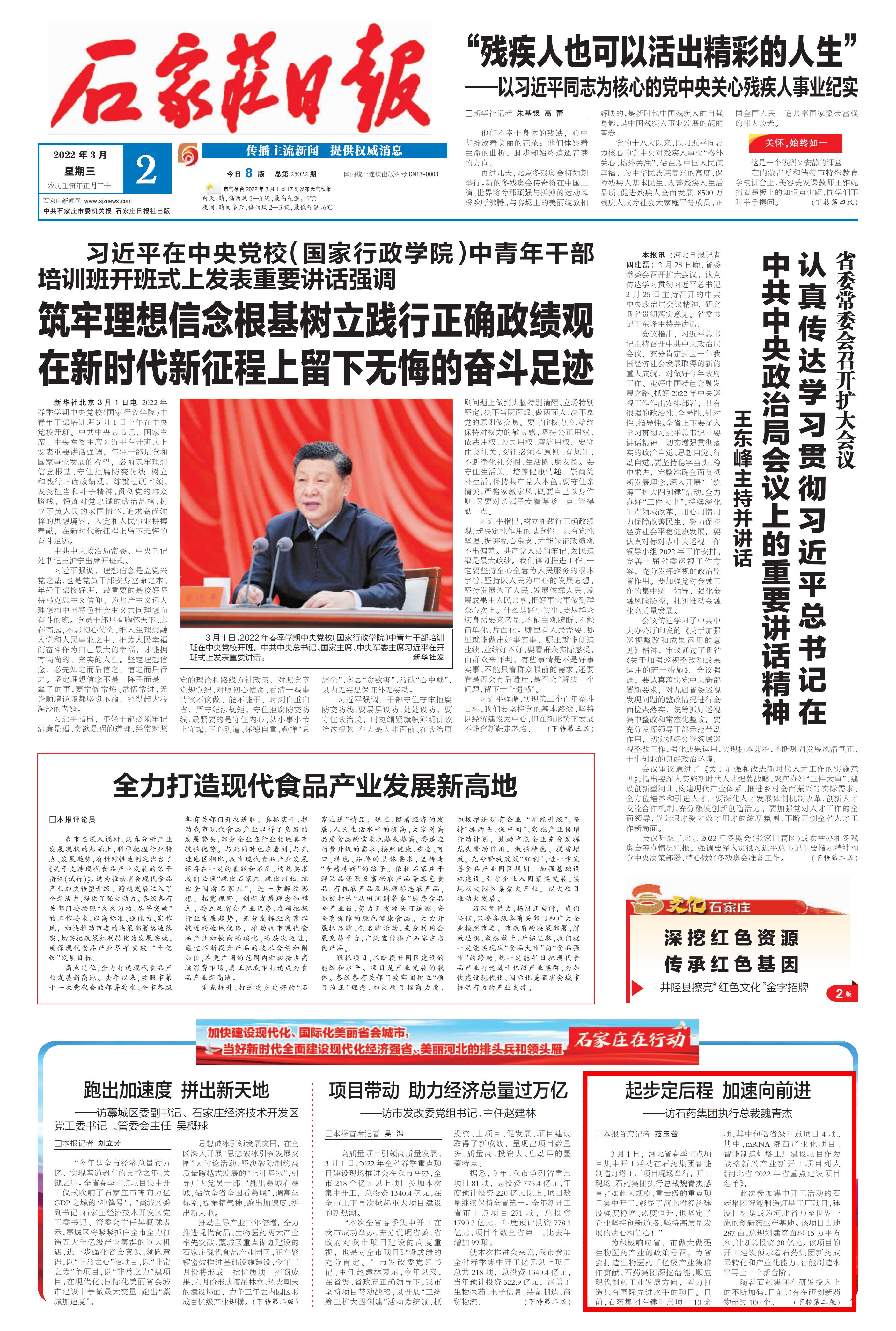 3月1日,河北省春季重点项目集中开工活动在石药集团智能制造灯塔工厂项目现场举行。开工现场,石药集团执行总裁魏青杰感言:“如此大规模、重量级的重点项目集中开工,彰显了河北省经济建设强度稳增、热度恒升,也坚定了企业坚持创新道路、坚持高质量发展的决心和信心!”