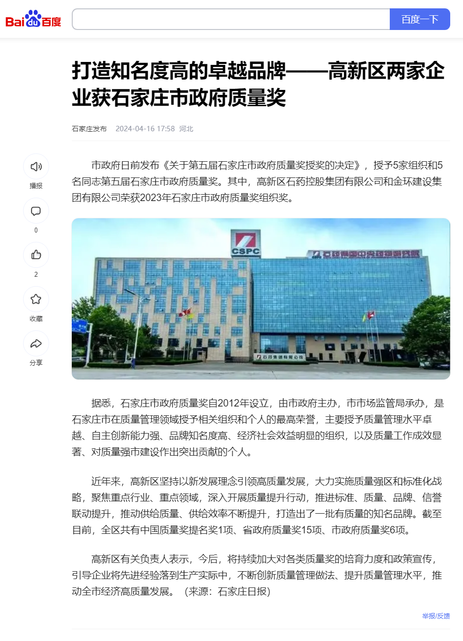 打造知名度高的卓越品牌——高新区两家企业获石家庄市政府质量奖