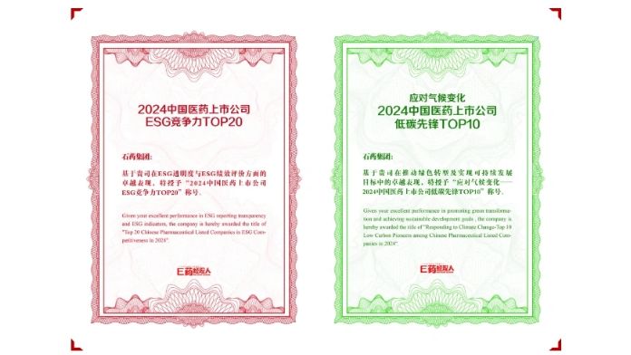 2024年11月14日,由中国医药企业管理协会、中国医药生物技术协会、四川省医药行业协会主办,E药经理人承办的2024第16届中国医药企业家科学家投资家大会(CHSESI,简称“启思会”)在成都举行。2024年度中国医药上市公司ESG竞争力系列榜单在会上正式揭晓,石药集团凭借在ESG透明度与ESG绩效评价方面的卓越表现,被授予“2024中国医药上市公司ESG竞争力TOP20”荣誉称号;并基于公司在推动绿色转型及实现可持续发展目标中的卓越表现,被授予“应对气候变化2024中国医药上市公司低碳先锋TOP10”。这两项荣誉肯定了集团在环境、社会和治理(ESG)方面付出的努力和显著成效,企业价值得到进一步的印证。