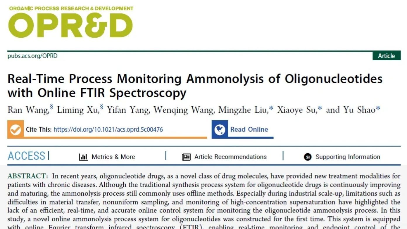 近日,由石药集团研发的基于红外光谱技术用于寡核苷酸在线氨解监测的研究成果以研究论文(Article)形式发表在国际著名化学期刊ACS旗下Org. Process Res. Dev.杂志,标题为《Real-Time Process Monitoring Ammonolysis of Oligonucleotides with Online FTIR Spectroscopy》。
